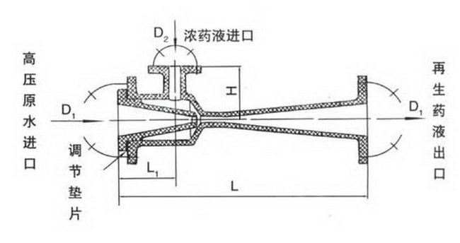 高壓原水通過管道閥門]進入噴射器的漸縮段,將靜壓頭轉換成動能,在噴嘴處成為高速射流,使混合室形成微真空狀態(tài)將高濃度的再生液吸入混合室,并使再生藥液的壓力和速度發(fā)生變化;在混合段內,水和藥液得到充分地混合,然后注經擴散段,使再生液減低流速,靜壓頭升高,再通過出口管道及閥門將稀再生液送到交換器本體中。